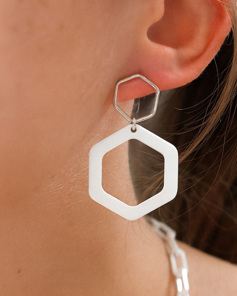 Estos pendientes modernos presentan dos hexágonos perfectamente alineados: uno en plata pura y el otro en zirconia blanca, creando un contraste elegante y lleno de carácter.